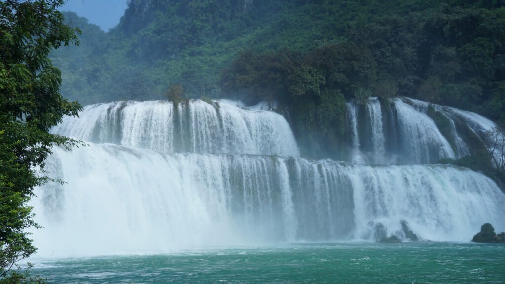 Towering over the landscape, Ban Gioc Waterfall marks the border between Vietnam and China with a majestic display of cascading water. Spanning multiple tiers across rocky cliffs, it is hailed as one of the most stunning waterfalls in the region.