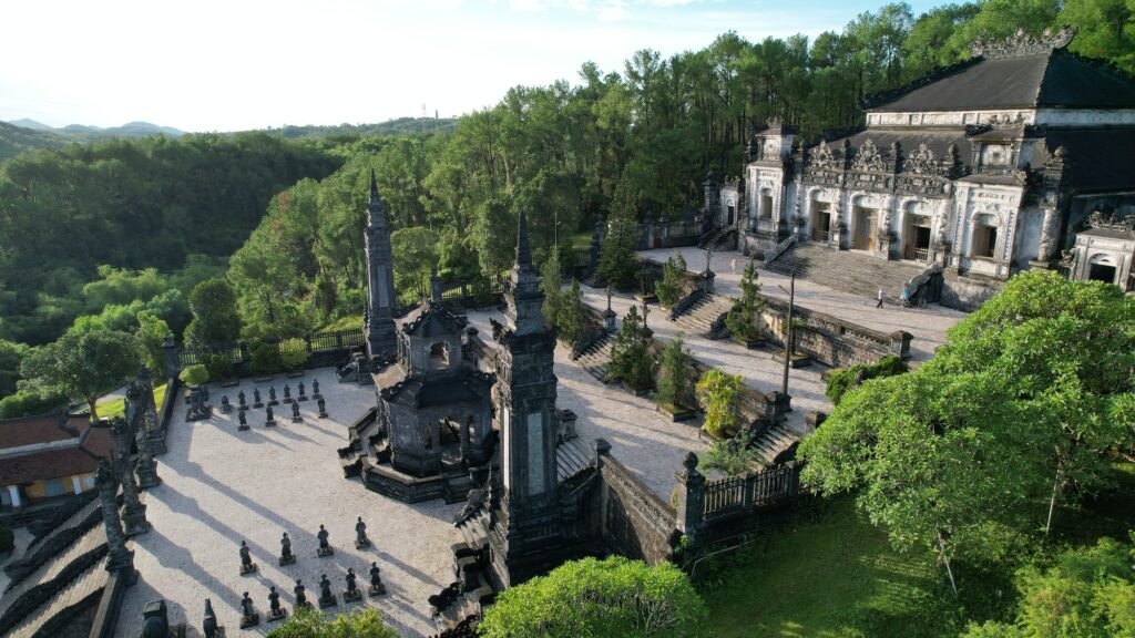 Perched on the hillside of Chau Chu Mountain, roughly ten kilometers from Hue’s city center, Khai Dinh Tomb stands as one of the most visually arresting monuments of Vietnam’s imperial era. Among the royal mausoleums of the Nguyen Dynasty, it is widely recognized as the most unconventional. Rather than blending gently into its surroundings, the tomb asserts itself through bold lines, dark surfaces, and a commanding sense of presence.
